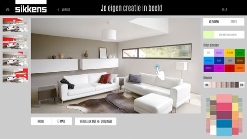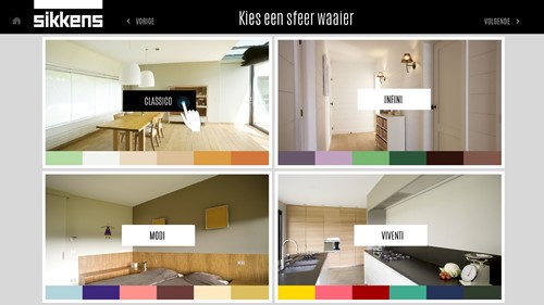 Picario created a touch screen supported application for Sikkens, a large paint manufacturer and supplier which is a part of AkzoNobel. The web application allows employees and customers to style their own interior based on nine room settings or four styles from the Sikkens color charts. A split screen lets users compare the original image and the recolored image. The result can be shared with others by email. The web application is used both online and as an in-store module on touch screen tablets and PCs.